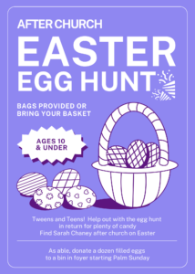 Following the Worship Service. For Children ages 10 and under. Bags are provided, or bring your own basket.